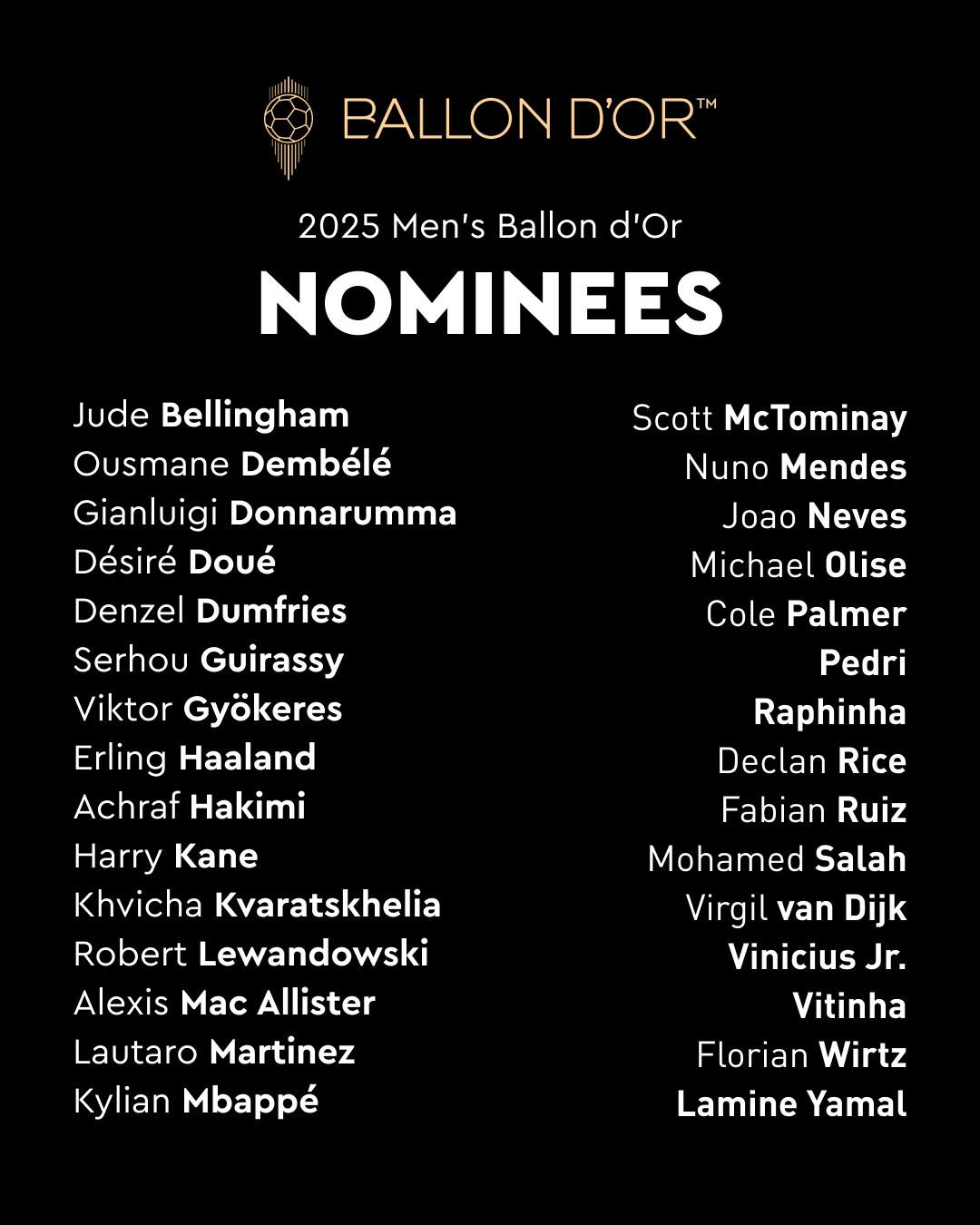 2025金球奖候选汇总:登贝莱、亚马尔领衔金球奖,杜埃领衔科帕奖