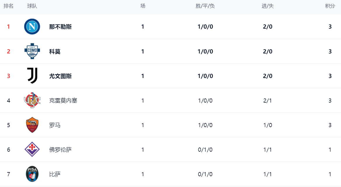 在积分榜上,那不勒斯、科莫、尤文图斯、克雷莫内塞和罗马都拿到3分。佛罗伦萨、卡利亚里、亚特兰大、比萨、热那亚和莱切都是1个积分。还有4支球队首轮比赛还莫得踢。