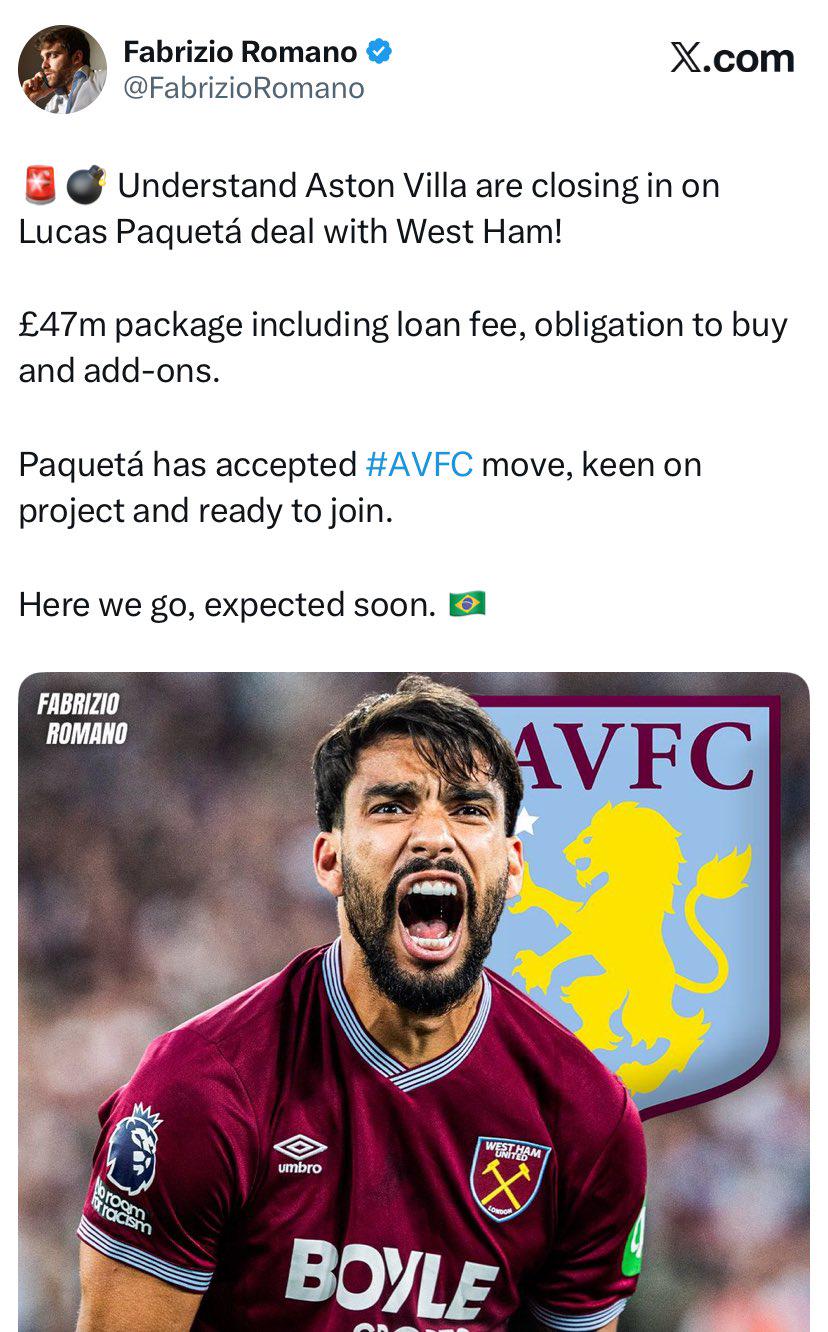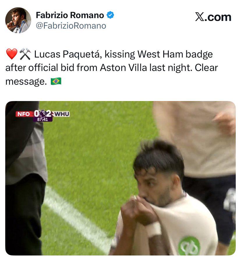 对此名记罗马诺写谈:“帕奎塔亲吻了西汉姆的队徽,给出了明确的信号。昨晚,阿斯顿维拉已奉上了负责的报价。”