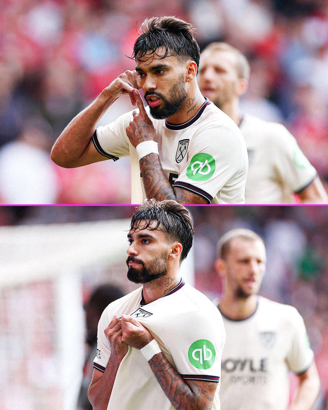值得一提的是,在比赛第88分钟罚入一个点球后,西汉姆中场帕奎塔演出了戏剧性的庆祝算作,他作念出了接电话的算作,随后又假装将电话扔掉,接着又亲吻了球衣胸前的队徽。