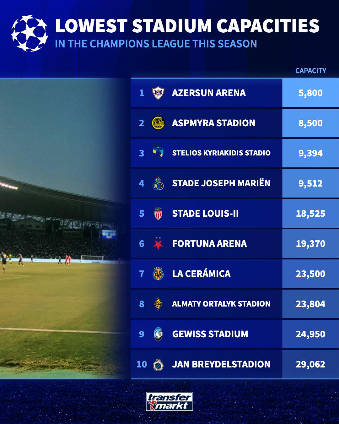 欧冠霸主皇家马德里的主场圣地亚哥·伯纳乌球场以83186东谈主名列榜首,阿塞拜疆球队卡拉巴克的主场可容纳东谈主数则最少仅有5800东谈主。