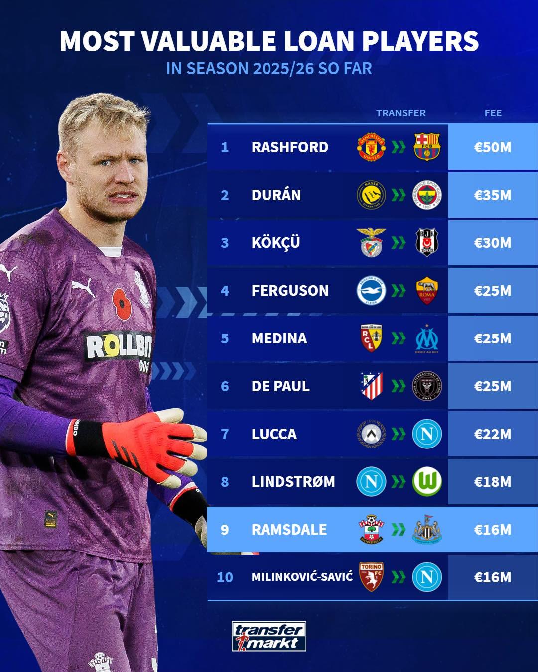 德国转会市集列出了本年夏窗租出球员身价榜TOP10。拉什福德以5000万欧的身价高居榜首,从南安普顿租出加盟纽卡斯尔联的门将拉姆斯代尔以1600万欧位列第九。