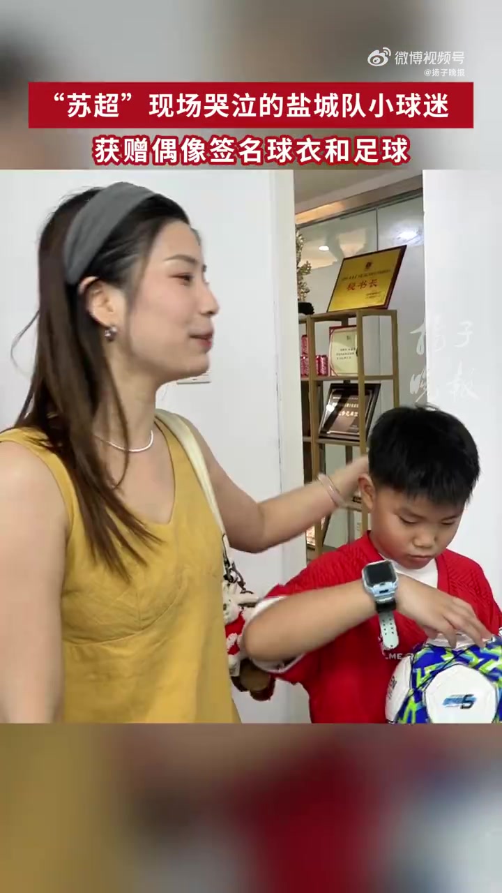 球场哽咽的盐城小球迷获赠签名球衣和足球,知道欢乐笑颜