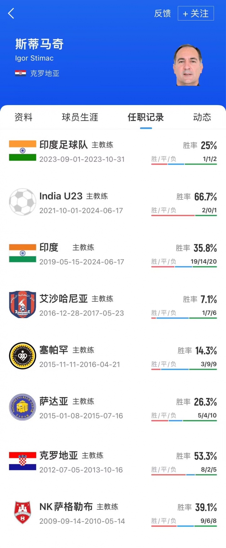 斯蒂马奇持教印度国度队技能,53场比赛战绩为19胜14平20负,2024年6月离任,当今处于待业情状。