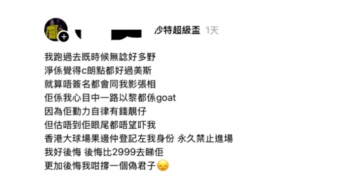 该球迷默示:跑畴昔的技术没念念太多,认为C罗好过梅西。就算不签名也会和我合影。他一直是我心目中的goat,因为粗重自律有钱还长得帅,但没念念到一眼皆没看我,中国香港大球场登记了我的身份,经久拒接入场。我好后悔,后悔花2999去看球,愈加后悔我撑握一个假道学。