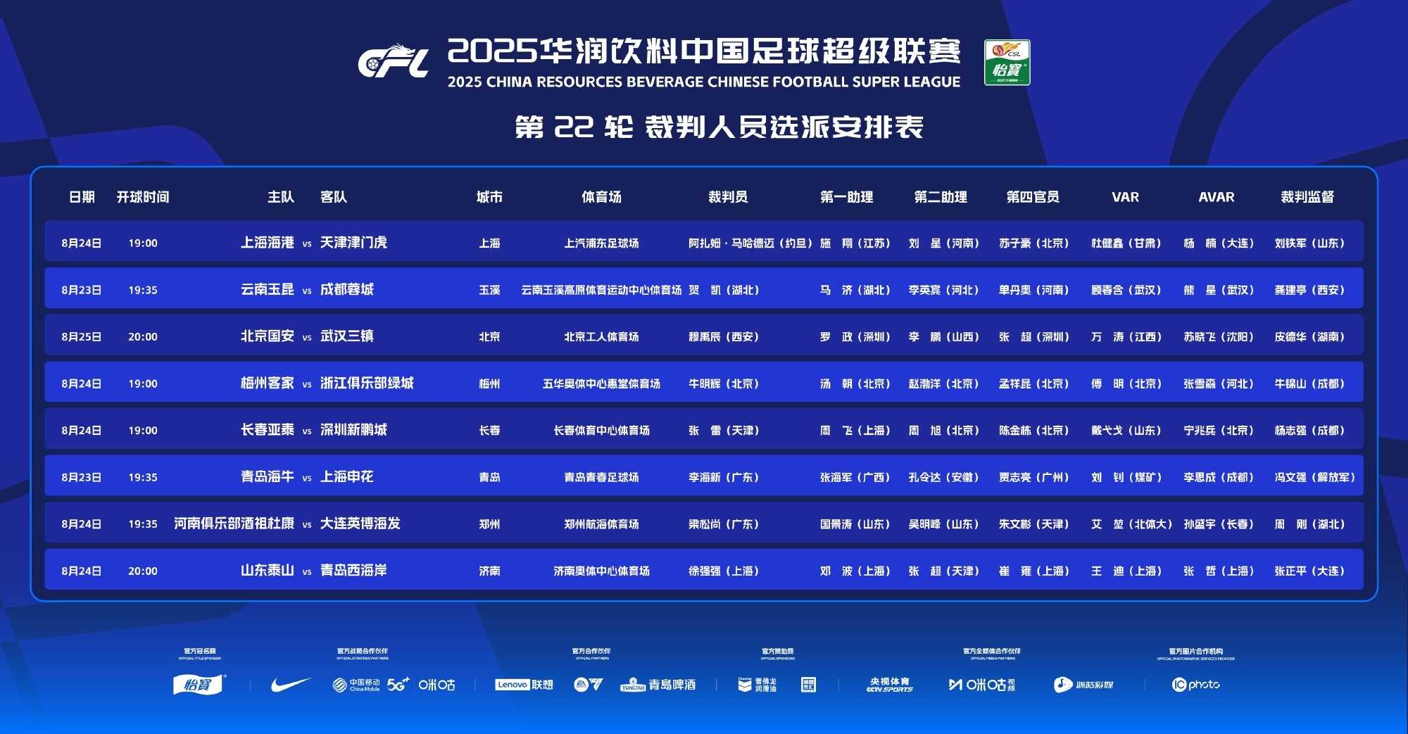 08月23日讯 中超第22轮裁判出炉,约旦裁判法律讲授海港vs津门虎,VAR杜健鑫。