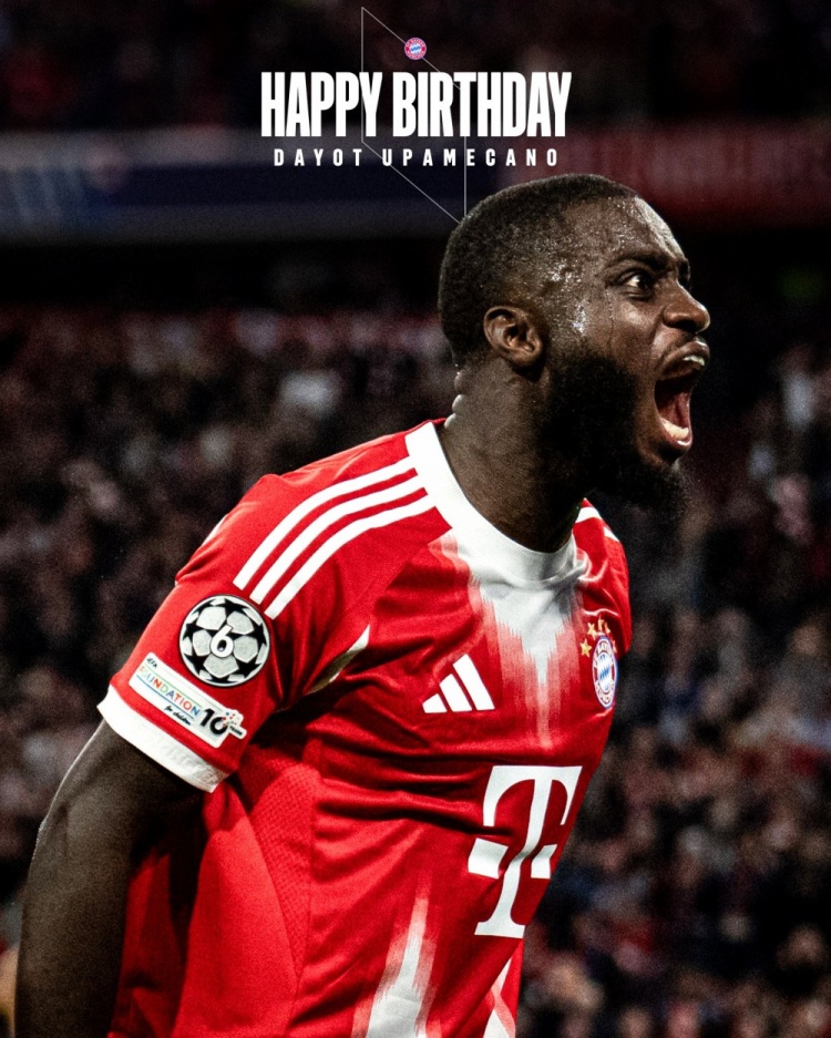 拜仁官方社媒晒出于帕梅卡诺的诞辰海报,配文:“诞辰昂扬,于帕梅卡诺今天27岁了。”