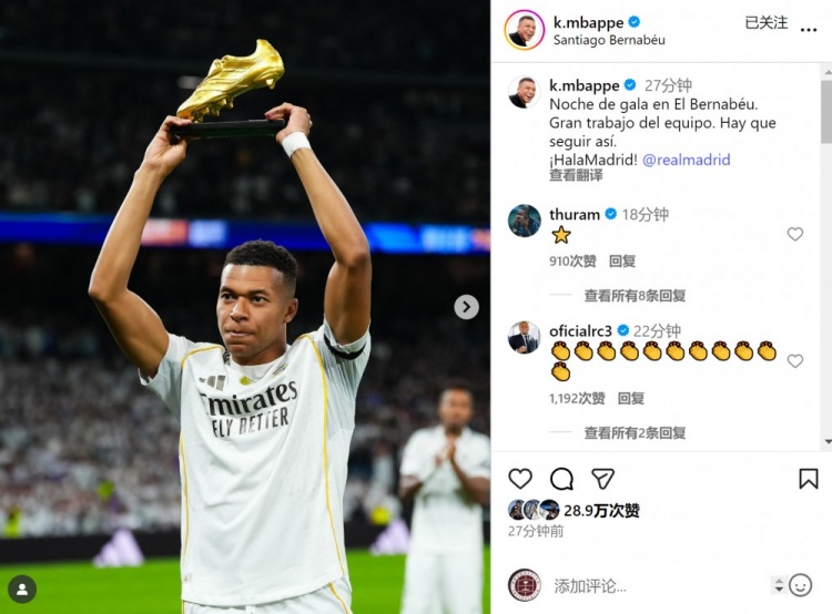 姆巴佩社媒晒出赛前展示欧洲金靴奖杯的相片,配文:“伯纳乌的华彩之夜,全队王人推崇出色,咱们要陆续保握!Hala Madrid!”