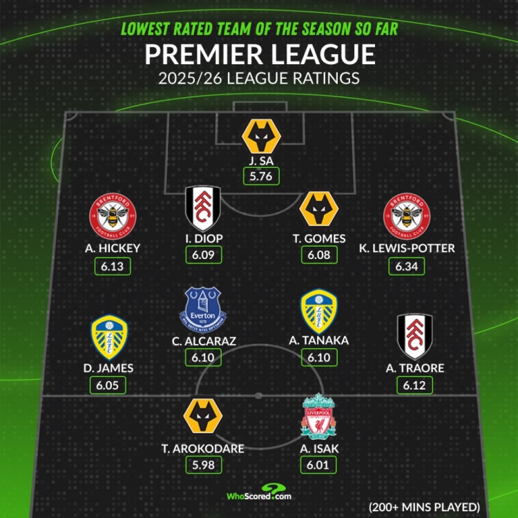 WhoScored本赛季英超评分最低声势:伊萨克、特劳雷、田中碧在列