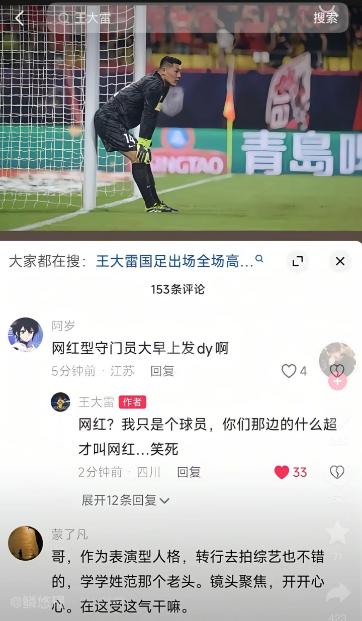 该网友驳倒:“守门员大早上发dy啊”。王大雷随后回应:“网红?我仅仅个球员,你们那里的什么超才叫网红...笑死”。