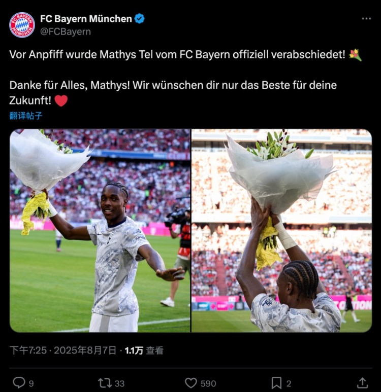 拜仁官方社媒写谈:开球前,拜仁精致送别马蒂斯-特尔!