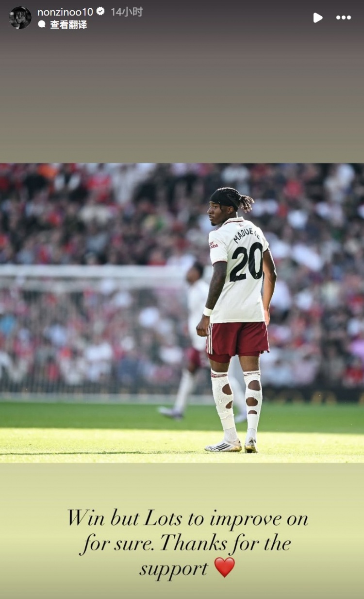 本场比赛阿森纳新援马杜埃凯替补登场,赛后他也在个东说念主社媒晒出本场相片,配文写说念:“天然获取得胜,关联词将来还有许多场所需要擢升,感谢大家的守旧!”