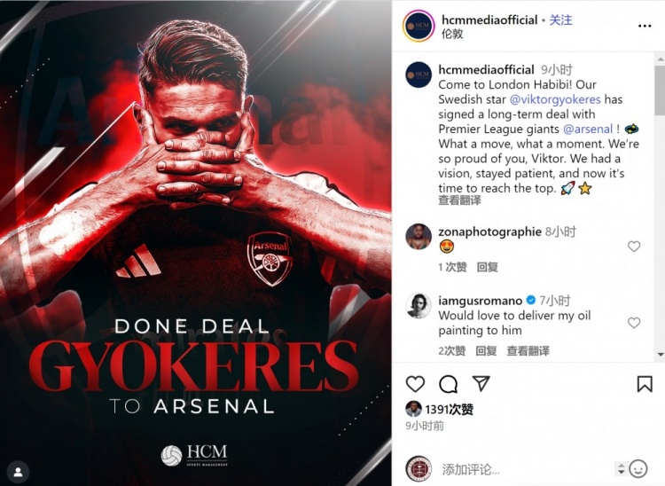 7月27日讯 葡萄牙体育中锋约克雷斯转会阿森纳,球员经纪公司HCM Sports Management社媒发文暗示道喜。