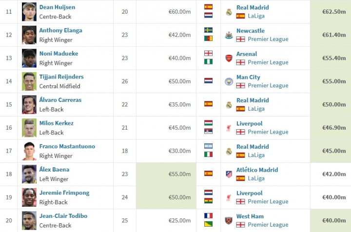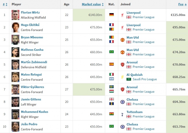 今夏球员转会费名次(单元:欧元/数据起原:德转/未激活浮动不计入):