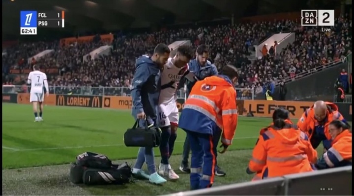 10月30日讯 法甲第10轮,巴黎对阵洛里昂。杜埃冲破中倒地,色彩相配不幸,终末被担架抬出场。