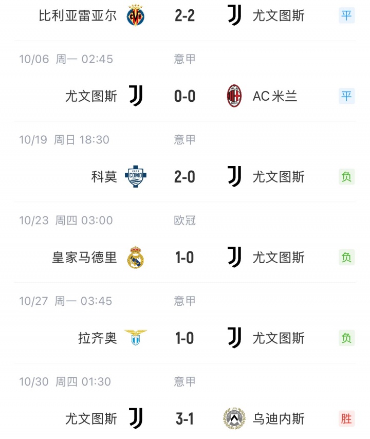 尤文此前8场5平3负,集中4场未进球,上轮不敌拉王人奥后图多尔被罢免。