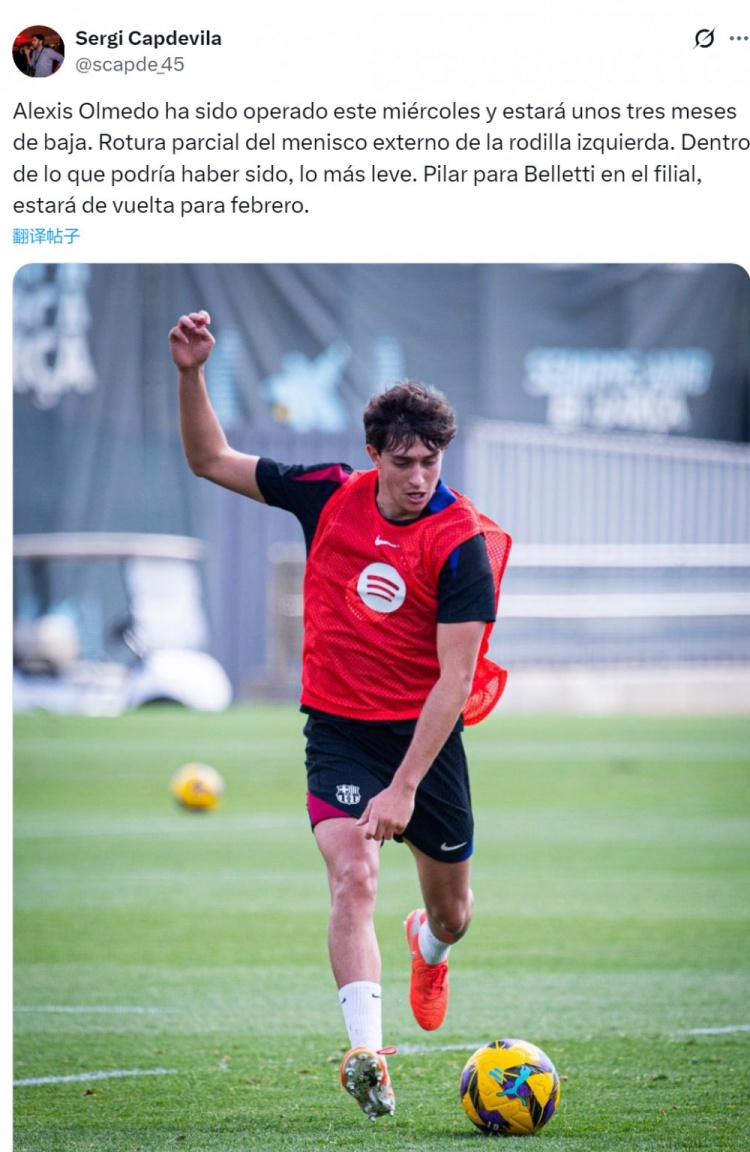 Sergi Capdevila败露,巴萨竞技(巴萨B队)小将奥尔梅多左膝外侧半月板部分扯破,在预期的伤情中,这是最轻飘的。奥尔梅多本日了摄取手术,展望将伤缺三个月,来岁2月回来。