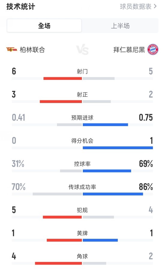 柏林联半场1-1拜仁数据:射门6-5,射正3-2,控球率31%-69%