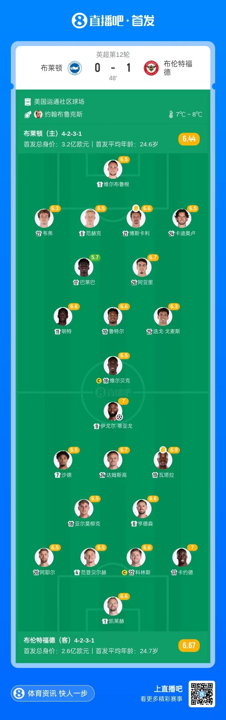 11月22日讯 北京本事23:00,英超第12轮布莱顿vs布伦特福德,比赛在好意思国运通社区球场打响!上半场,巴莱巴送点,伊戈尔·蒂亚戈点射破门!半场范畴,布莱顿暂时0-1逾期布伦特福德。