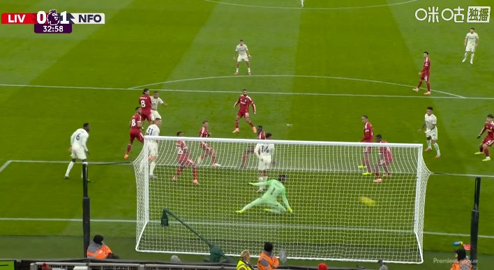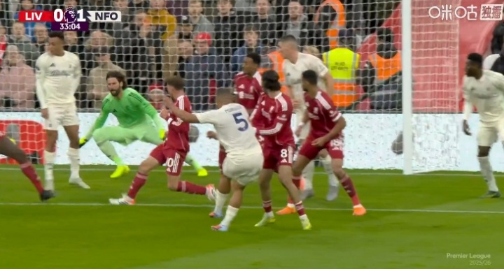 11月22日讯 英超第12轮,利物浦vs诺丁汉丛林,比赛第33分钟,诺丁汉丛林角球契机,穆里略破门。利物浦0-1过期。但慢镜头败露,处于越位位置的恩多耶疑似喧阗了阿利松的视野。