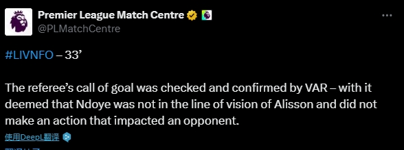 英超官方说明说念:经由VAR搜检和阐发,恩多耶不在阿利松视野界限之内,也莫得作念出影响敌手的看成。