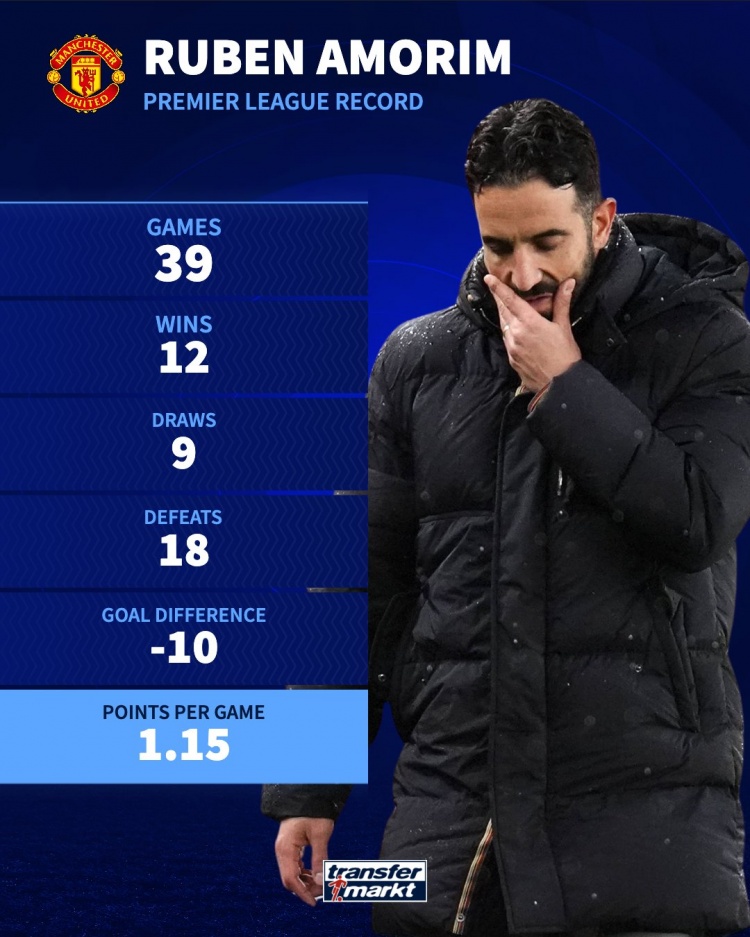 德国转会市集统计了阿莫林捏教曼联的英超数据,他携带曼联插足39场英超比赛,战绩12胜9平18负,净胜球-10,场均拿到1.15分。