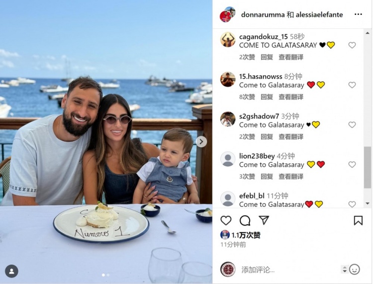 多纳鲁马社媒晒出与家东说念主共度奥秘时光的像片,餐盘上写有“Numero 1”(Number 1)字样,配文:“我的全宇宙。”许多球迷在多纳鲁马的动态底下留言刷屏,但愿他能加盟加拉塔萨雷。