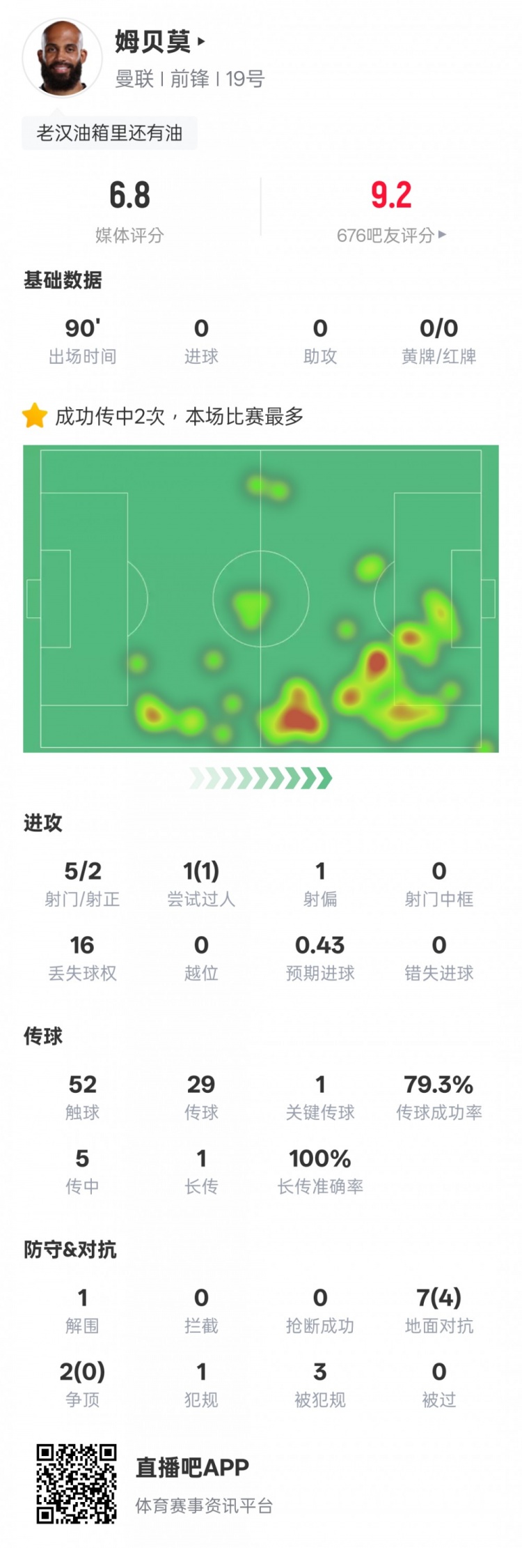 8月18日讯 2025-26赛季英超首轮,曼联主场迎战阿森纳。姆贝莫首发出战,踢满全场,送出1次要害传球,有1次过东说念主张效,还送出1次突围,但也有16次丢失球权,评分6.8。
