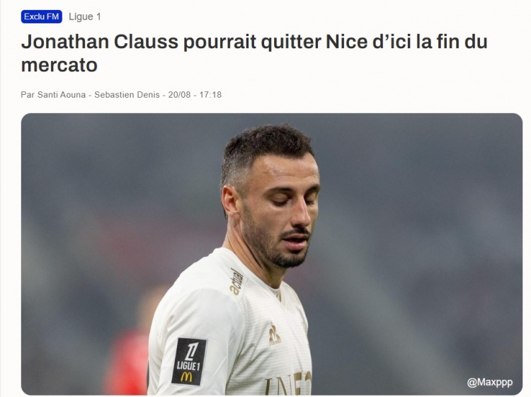 该记者写谈:“独家音问:乔纳森-克劳斯可能会在转会窗关闭前离开尼斯。”