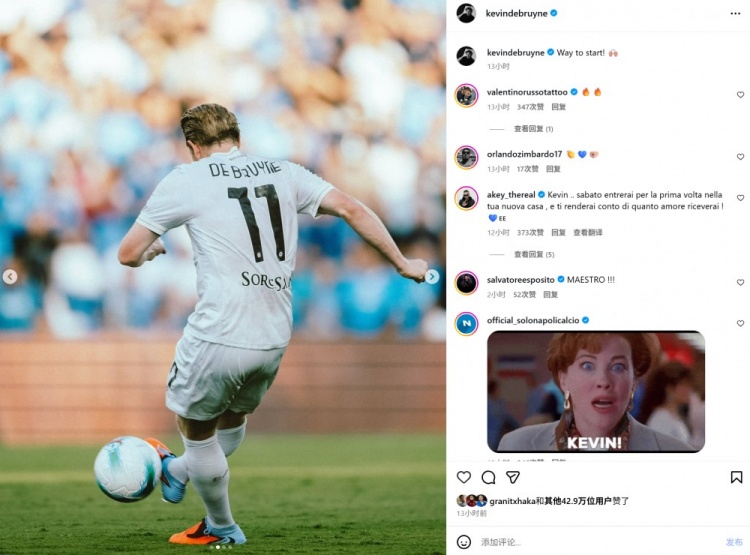 意甲首战破门,德布劳内社媒晒破门蓦地:以可以的边幅开启新赛季