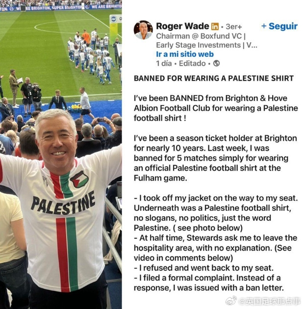 布莱顿赛季票抓有者罗杰-韦德(Roger Wade)社媒发文,暗示我方因身穿巴勒斯坦国度队官方球衣,被俱乐部禁赛五场。