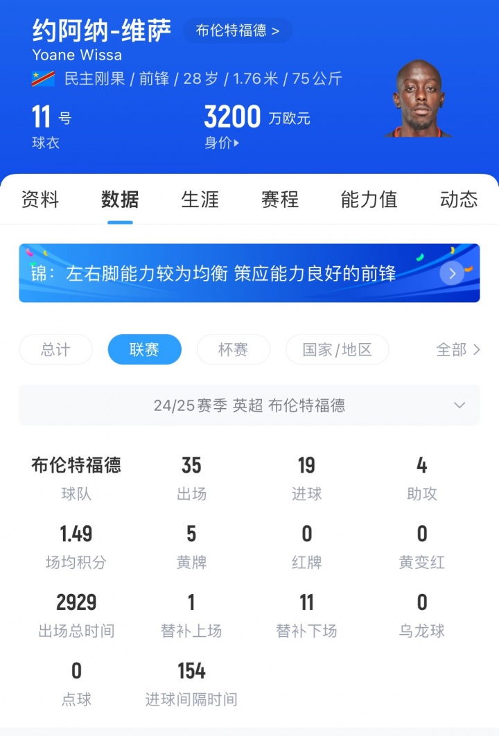 28岁的维萨还有1年协议,球员24-25赛季39场20球4助攻,德回身价3200万欧。