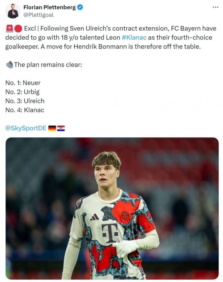 媒体指出,乌尔赖希续约之后,拜仁决定让他担任三号门将,18岁克拉纳克担任四号门将,引进卢多戈雷茨门将邦曼的预备已取消。