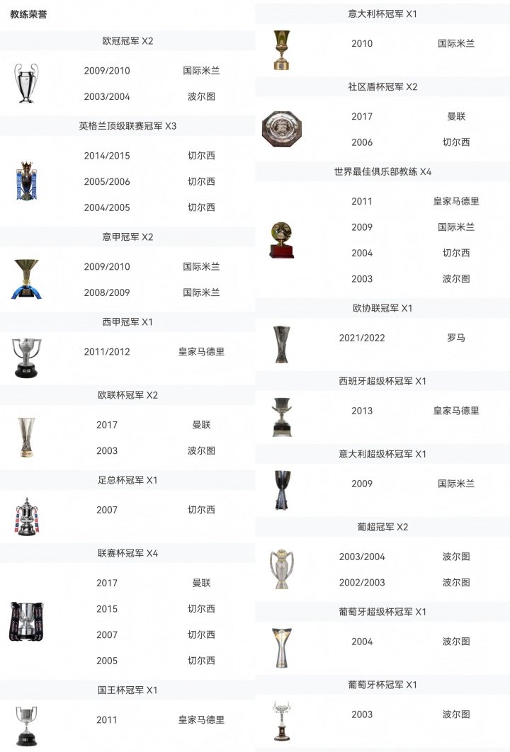 穆里尼奥现年62岁,抓教生活从葡萄牙体育起步,历任本菲卡、莱里亚、波尔图、切尔西、国米、皇马、切尔西、曼联、热刺、罗马和费内巴切主帅,他的下一站是哪儿?