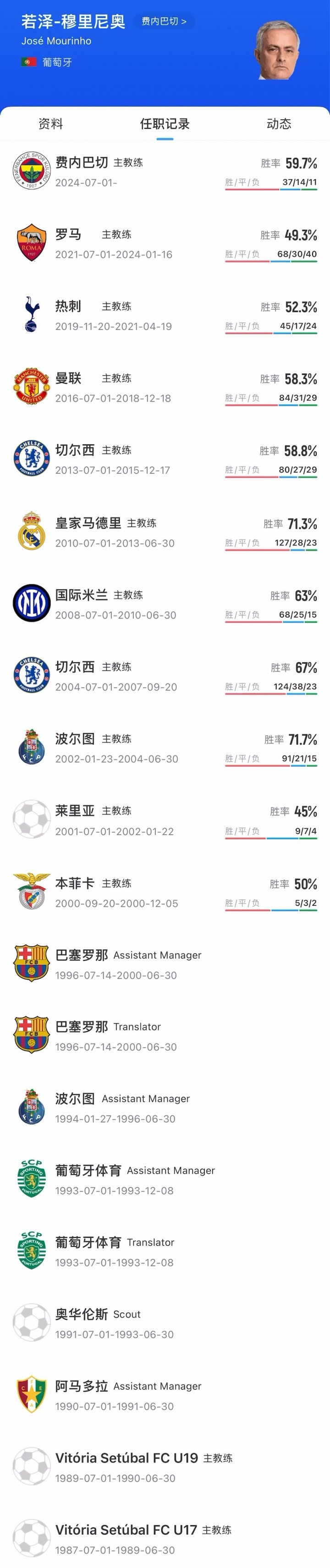 这是穆里尼奥做事糊口第11次从俱乐部主训诲的职位卸任。值得一提的是,穆里尼奥这次握教费内巴切时长仅一年,远低于此前几次握教的时长。