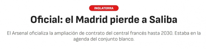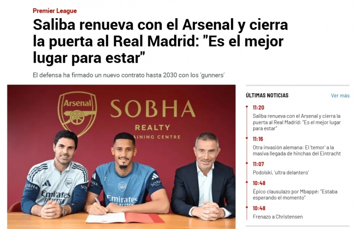 《阿斯报》的题目则是《官方:皇马错过萨利巴,阿森纳官宣与法国中卫续约至2030年,这名球员正本在皇马的引援权术中》
