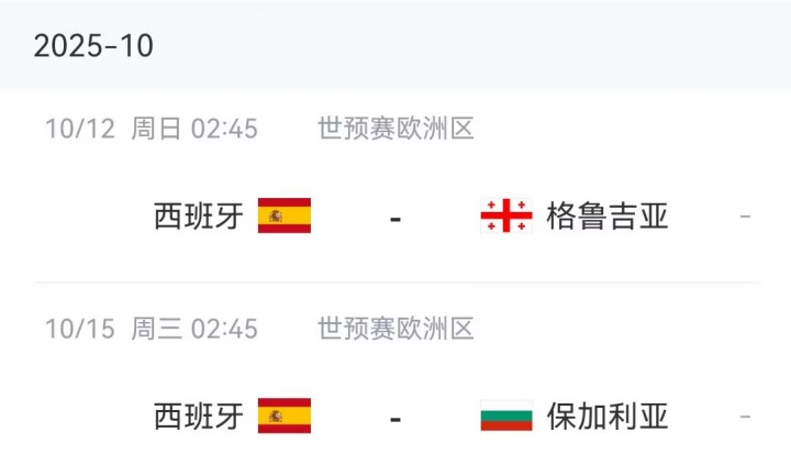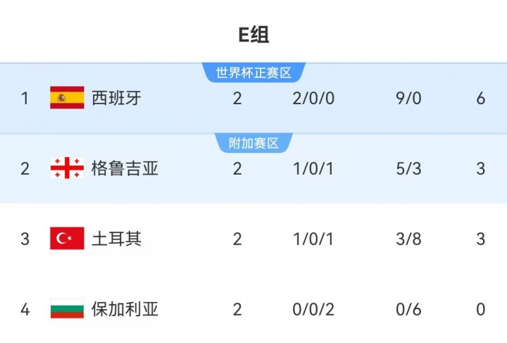 西班牙本月将进行两场世初赛欧洲区比赛:10月12日主场迎战格鲁吉亚,10月15日迎战保加利亚。当今西班牙活着初赛欧洲区E组2战全胜排行第1。