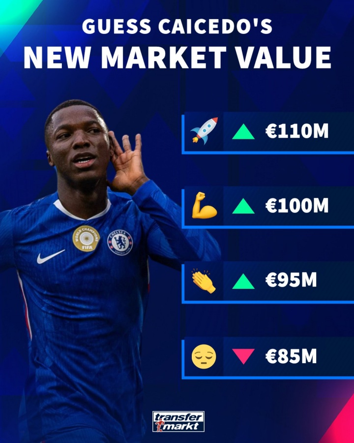 凯塞多现在身价为9000万欧,这次更新最高将涨至1.1亿欧,成为英超第10位亿元先生,最低将着落至8500万欧。