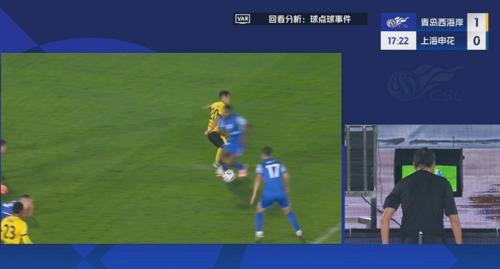 10月17日讯 西海岸vs申花比赛第17分钟,西海岸门将突围不远,马纳法禁区内被放倒,主裁在不雅看VAR后决定判罚点球。