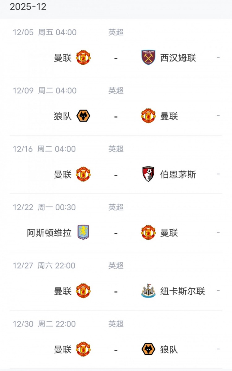 曼联是唯逐一支在圣诞节前畅达进行三场周中英超比赛的球队:12月4日周四主场对西汉姆联,随后周一客战狼队,接着再过几上帝场迎战伯恩茅斯。此外,原定12月27日周六主场对纽卡的比赛也可能被移至节礼日晚间进行。