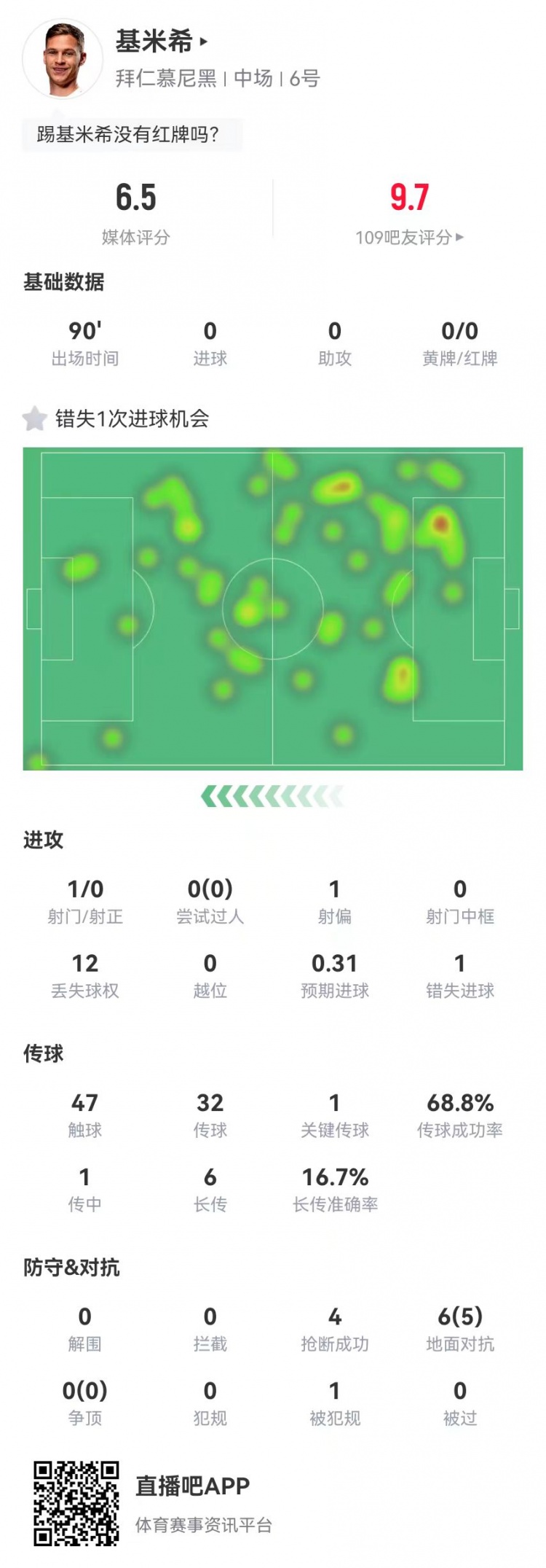 基米希本场1射1失良机+1关键传球 4抢断+6抵抗5得手 仅获6.5分
