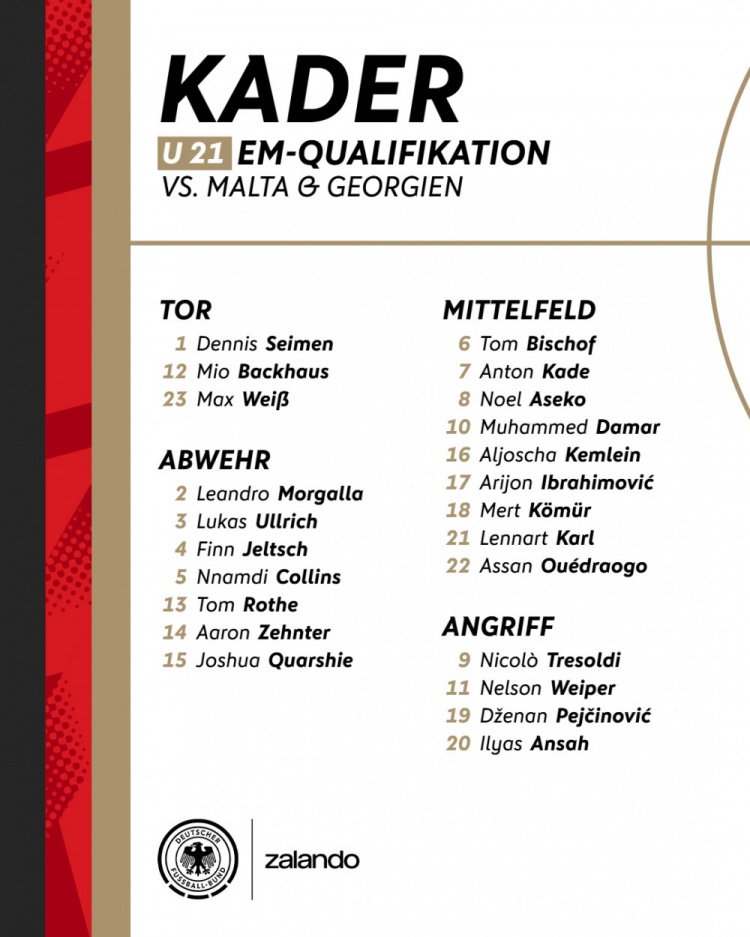 11月7日讯 德国U21公布新一期球员名单,卡尔、比朔夫、小伊布在列,德国U21将在U21欧洲杯预选赛中对阵马耳他U21、格鲁吉亚U21。