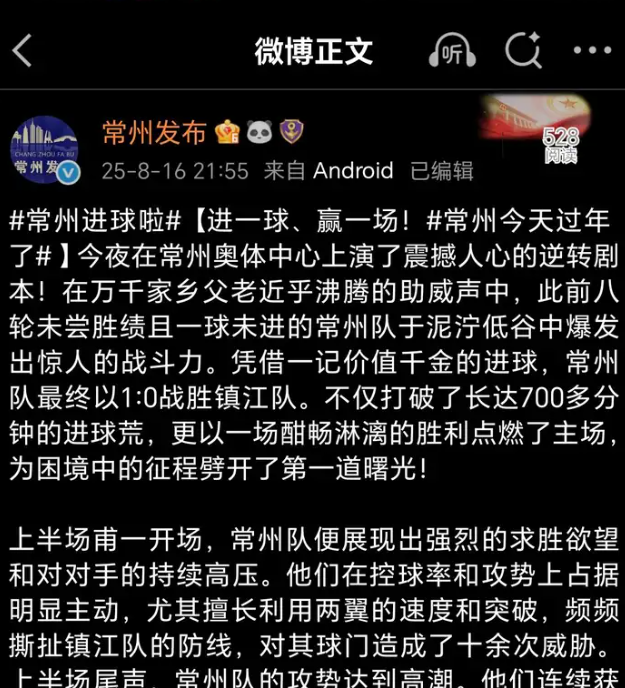 但8月16日,前八轮比赛未曾胜绩的常州队主场对阵镇江队,打入了苏超联赛的首粒进球,并凭此赢得了首场收效,以1比0投降了镇江队。